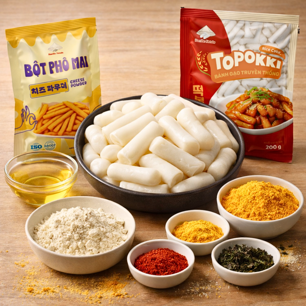 Bánh gạo Hàn Quốc là nền tảng của hàng trăm biến tấu hấp dẫn, trong đó Tokbokki Lắc Phô Mai là lựa chọn dễ làm – dễ bán – dễ nghiện nhất hiện nay.